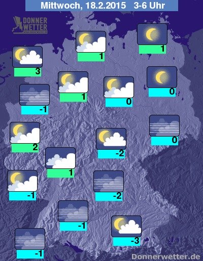 In der kommenden Nacht ist es im Norden und Westen noch gebietsweise stark bewölkt, dazu bleibt es aber meist trocken. Im übrigen Land ist es zumeist locker bewölkt oder sternenklar und dabei trocken, jedoch bildet sich stellenweise Nebel oder Hochnebel. Die Tiefstwerte liegen bei 3 Grad in Bremerhaven und -3 Grad im Alpenvorland.