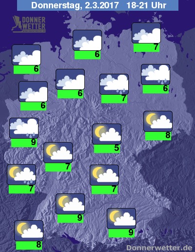Am Abend ist es vor allem in der Osthälfte weiterhin noch sehr stürmisch. Sonst flaut der Wind von Westen her etwas ab. Am Niederrhein und an der Spree regnet es vereinzelt noch leicht, sonst ist es überall trocken.