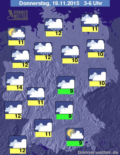 In der kommenden Nacht fällt zunächst über der Nordhälfte unter dichten Wolken zum Teil kräftiger Regen. Weiter nach Süden hin ist es zunächst noch trocken und teils aufgelockert bewölkt, im weiteren Verlauf erreichen die Regenwolken aber auch den Norden von Bayern und Baden-Württemberg. Gegen Morgen lassen die Niederschläge im Norden und Westen hingegen nach und gebietsweise kann es hier auch auflockern. Die Temperatur sinkt auf 14 Grad in Aachen und bis 9 Grad im München. Es weht verbreitet starker, teils auch stürmischer Wind, an der Nordsee herrscht Sturm mit möglichen Orkanböen.