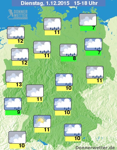 Heute Nachmittag lockert die Bewölkung im Südwesten meist etwas auf und hier bleibt es dann weitgehend trocken. Im großen Rest der Republik halten sich dagegen dichte Wolken und es fällt verbreitet, oft auch langanhaltender und regional ergiebiger Regen. im Nordosten ist es anfangs noch trocken, zum Abend hin zieht aber auch hier Regen auf. Die Temperatur liegt bei 7 Grad in Vorpommern und milden 13 Grad in Aachen. Über der Südwesthälfte der Republik weht ein oft starker und in Böen stürmischer Wind.