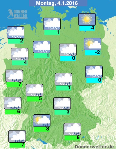 Zum Start in die neue Wetterwoche ist es nur im Nordosten oft sonnig und trocken, im Osten ist es locker oder aufgelockert bewölkt und ebenso trocken, im übrigen Land ziehen dagegen dichte Wolken durch, die immer wieder Regen, Schneeregen oder auch Schnee bringen, dabei besteht Glättegefahr! Die Temperatur steigt auf -4 bis 7 Grad.