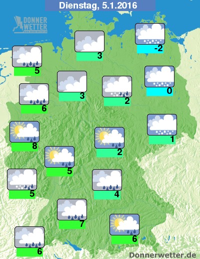 Am Dienstag zieht überwiegend starke Bewölkung durch, hier und da kann es auch mal auflockern. Es fällt jedoch zeitweise Regen, Schneeregen oder Schnee, dabei ist wiederum Glätte möglich! Die Temperatur steigt auf -2 bis 8 Grad.