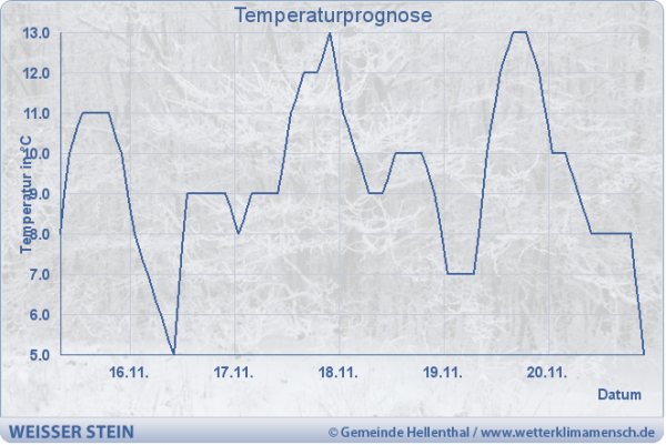 Ab dem kommenden Wochenende sinken die Temperaturen stark ab. Es wird nasskalt. Während der Woche ist es zeitweise sehr mild. Die folgende Temperaturkurve reicht bis zum Freitag. Während des Sturms zur Wochenmitte ist es sehr mild. Am kommenden Wochenende werden nur noch 0-5 Grad C gemessen.