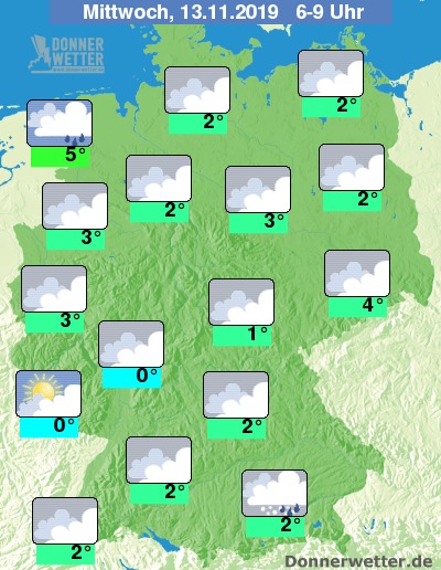 In der Nacht zeigt sich der Himmel in der Nordhälfte zunächst noch häufig locker oder aufgelockert bewölkt, bevor die Bewölkung im Nachtverlauf zunimmt. In der Südhälfte des Landes bleibt der Himmel über die gesamte Nacht stark bewölkt oder bedeckt. Es bleibt überwiegend trocken, nur südlich des Mains sowie im äußersten Südosten muss zeitweise mit Schauern gerechnet werden. Im Schwarzwald sowie in Oberbayern fallen die Niederschläge auch als Schneeregen oder Schnee. Örtlich besteht Glättgefahr!