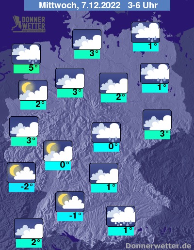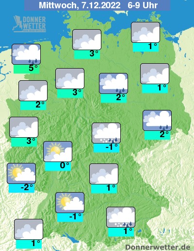 Die Wochenmitte startet verbreitet mit einer geschlossenen Wolkendecke, Wolkenlücken zeigen sich in den Frühstunden am ehesten im Südwesten. Im Norden und der Mitte muss zeitweise mit Regen-, Schneeregen- oder Graupelschauern gerechnet werden. Im Norden weht dabei ein mäßiger, an den Küsten auch frischer bis stürmischer Nordwestwind.