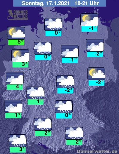 Am Montag halten sich von Bayern bis nach Brandenburg dichte Wolken und es fällt zeitweise Schnee, teils auch Schneeregen. Weiter nach Westen hin ist es oft trüb oder stark bewölkt, vor allem im Südwesten und Nordwesten zeigen sich aber auch oft heitere Abschnitte, dabein bleibt es trocken. Die Temperatur steigt auf 0 Grad im Saargau und bis 5 Grad im nördlichen Emsland.