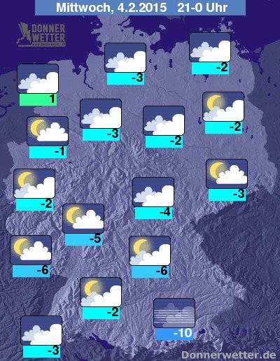 In der Nacht zum Donnerstag ziehen vom Norden bis zur Mitte Deutschlands oft dichte Wolken durch, die für zeitweilige Schneefälle sorgen können, auch im Süden halten sich verbreitet dichte Wolken, dabei fällt jedoch nur gelegentlich Schnee. In den anderen Regionen ist es hingegen häufig locker oder aufgelockert bewölkt und es bleibt weitgehend trocken. Die Tiefstwerte liegen zwischen -1 Grad an der Wesermündung und -8 Grad in Landshut.