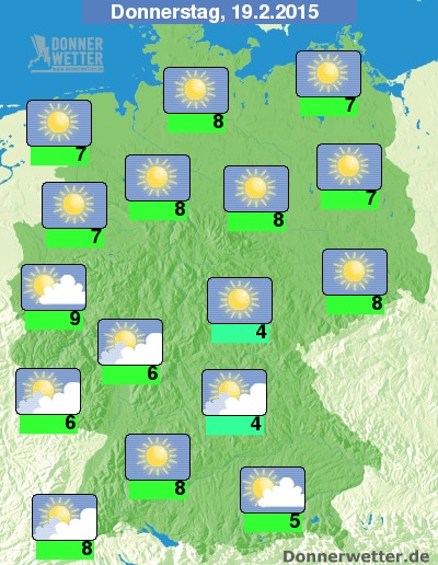 Es bleibt dazu landesweit trocken. Die Höchstwerte erreichen 4 Grad im Grabfeld und bis 9 Grad in der Kölner Bucht.
