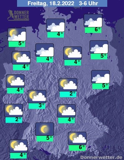 In der bevorstehenden Nacht zeigt sich der Himmel vor allem im Süden, aber auch über der übrigen Südhälfte oft locker bewölkt oder sternenklar. Weiter nach Norden hin ist es dagegen meist stark, hier und da auch etwas aufgelockert bewölkt, dazu bleibt es weitgehend trocken. Die Temperatur sinkt auf 6 Grad in Stralsund und bis 2 Grad in Saarbrücken. Der Wind weht anfangs noch oft stürmisch, an den Küsten herrscht noch teils Sturm. Im Laufe der Nacht lässt der Wind jedoch spürbar nach.