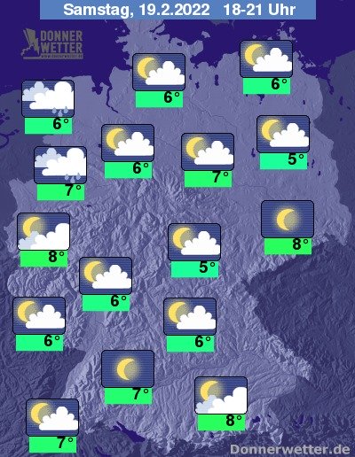 Heute Abend setzt vom Niederrhein bis ins Emsland Regen ein. Im übrigen Land bleibt der Himmel meist locker bewölkt, oft sogar sternenklar, dazu bleibt es trocken. Der Wind weht an den Küsten und im Westen des Landes verbreitet stürmisch, sonst teils stark. Die Temperatur liegt bei 5 Grad in Berlin und bis 8 Grad in München.