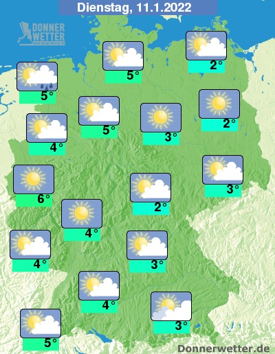 Am Dienstag ist es oft stark bewölkt oder trüb, vielerorts zeigen sich aber auch Auflockerungen, dabei bleibt es landesweit trocken. Die Temperatur erreicht 2 Grad in Berlin und bis 6 Grad in Köln.