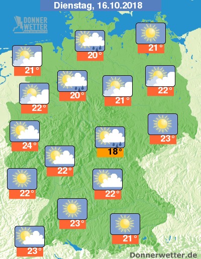 Am Dienstag ist es vor allem im Süden verbreitet sonnig, weiter nach Norden hin ist es auch oft heiter bis sonnig, gebietsweise können allerdings auch einige, teils dichte Wolken durchziehen, dabei sind über Niedersachsen einzelne Schauer möglich, sonst bleibt es aber weitgehend trocken. Die Temperatur erreicht 18 Grad im Grabfeld und bis 24 Grad im Rheinland.