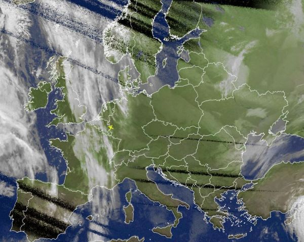 Auf dem Satellitenfoto von heute Morgen zeigt sich ein von Norden nach Süden gestrecktes Wolkenband über Westeuropa, es brachte in weiten Teilen Frankreichs und auch in den östlichsten Landesteilen der Britischen Inseln regnerisches, jedoch mildes Wetter.