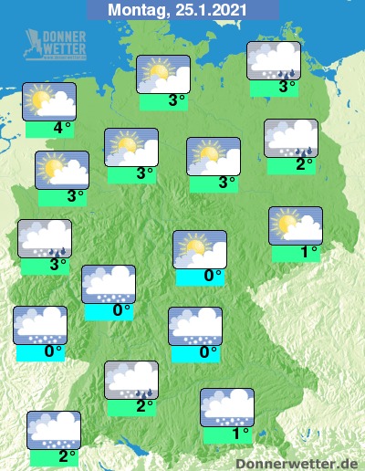 Am Montag zeigt sich das Wetter im Westen oft heiter bis sonnig und trocken, im übrigen Land halten sich hingegen dichte Wolken, dabei fällt gebietsweise Schnee, zum Teil auch Schneeregen. Die Temperatur steigt auf 0 Grad im Saargau und bis 4 Grad an der Nordsee.