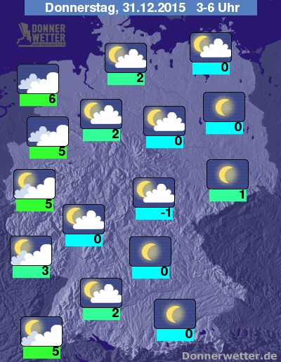 In der Nacht zum Donnerstag bleibt es im Osten und Südosten bis zum Morgen meist sternenklar, im Norden und Westen ist es zunächst meist locker bis aufgelockert bewölkt und trocken. Im Laufe der zweiten Nachthälfte ziehen dort zunehmend dichte Wolken auf und gegen Morgen setzt in den westlichen Landesteilen Regen ein, der sich bis zu einer Linie vom Schwarzwald bis zur Nordsee ausbreitet, weiter nach Osten bleibt es noch trocken. Die Temperatur sinkt auf 6 Grad in Ostfriesland und bis etwa -1 Grad im Grabfeld. An den deutschen Küsten weht ein oft starker und teils stürmischer Wind.