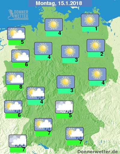 Heute scheint nach örtlicher Nebelauflösung noch verbreitet die Sonne. Im Südwesten ziehen aus Südwesten jedoch bereits vormittags immer mehr und dichterwerdende Wolken auf, die am Nachmittag im Süden und Südwesten auch gebietsweise Regen bringen, sonst bleibt es noch trocken. Die Temperatur steigt auf 1 Grad in Stralsund und bis 8 Grad in Köln.