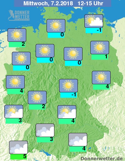 Heute Nachmittag scheint etwa nördlich des Mains die Sonne von einem verbreitet stahlblauen Himmel. Südlich des Mains halten sich hingegen überwiegend dichte Wolken, dabei bleibt es aber trocken. Die Temperatur liegt bei -1 Grad im Grabfeld und bis 5 Grad im Breisgau.