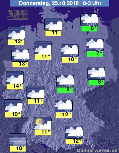 In der Nacht ist der Himmel meist dicht bewölkt oder bedeckt, später kann es im Süden dann regional auflockern. Mit Schauern muss vor allem noch in der Osthälfte des Landes gerechnet werden.