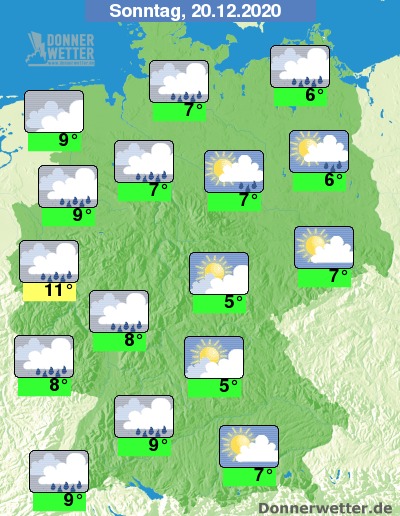 Heute ist es im Osten und Südosten zum Teil heiter, sonst ziehen aber überwiegend dichte Wolken durch, dabei fällt in einem Band von Südwest- bis Nordostdeutschland gebietsweise Regen, sonst bleibt es hingegen weitgehend trocken. Die Temperatur steigt auf 5 Grad im Grabfeld und bis 11 Grad in der Kölner Bucht.