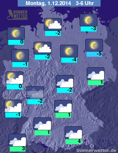 In der kommenden Nacht halten sich im Süden und Südosten des Landes dichte Wolken, aus denen es hier und da auch regnen kann, sonst ist es häufig aufgelockert bewölkt oder neblig-trüb, im Norden dagegen meist nur locker bewölkt oder auch sternenklar und es bleibt trocken. Gebietsweise bildet sich Nebel oder Hochnebel. Die Temperatur sinkt auf 4 Grad in München und bis auf frostige -5 Grad in Potsdam.