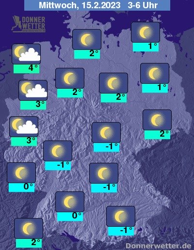 In der Nacht zum Mittwoch ist der Himmel zumeist sternenklar. Im Laufe der zweiten Nachthälfte nimmt im Westen und Nordwesten die Bewölkung etwas zu. Es bleibt bundesweit trocken bei Tiefstwerten von 4 Grad an der Nordsee und -1 Grad in Mittelfranken.