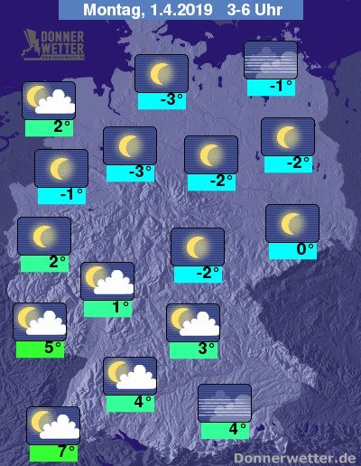 In der folgenden Nacht zieht über der Südhälfte des Landes hier und da noch aufgelockerte Bewölkung durch, sonst ist es jedoch verbreitet nur gering bewölkt oder sogar sternenklar. Es bleibt trocken bei Tiefstwerten zwischen 7 Grad in Freiburg und etwa -3 Grad in der Lüneburger Heide.