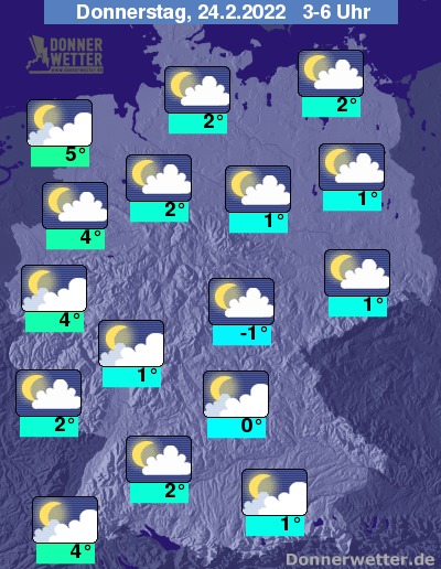 In der folgenden Nacht ist es anfangs noch oft locker bewölkt und teils sternenklar, von Westen her ziehen jedoch mehr und mehr und teils auch dichte Wolken heran, dazu bleibt es aber trocken. Die Temperatur sinkt auf 5 Grad in Emden und bis -1 Grad in Jena. An den Küsten weht weiterhin ein oft stürmischer Wind.