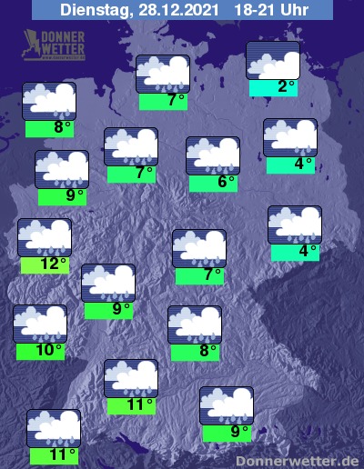 Heute Abend ist der Himmel bedeckt und es fällt immer wieder Regen. Die Temperatur liegt bei 2 Grad in Neubrandenburg und bis 12 Grad in Köln.