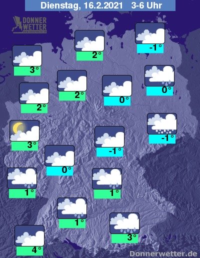 In der kommenden Nacht ist es weitgehend bedeckt, häufig ist es neblig-trüb, dazu fällt im Süden und Osten gebietsweise, sonst nur vereinzelt Regen. Im Osten und Südosten ist anfangs auch noch Schnee, Schneeregen und gefrierender Regen möglich, dabei besteht erhöhte Glättegefahr! Die Temperatur sinkt auf 4 Grad in Freiburg und bis -1 Grad in Neubrandenburg.