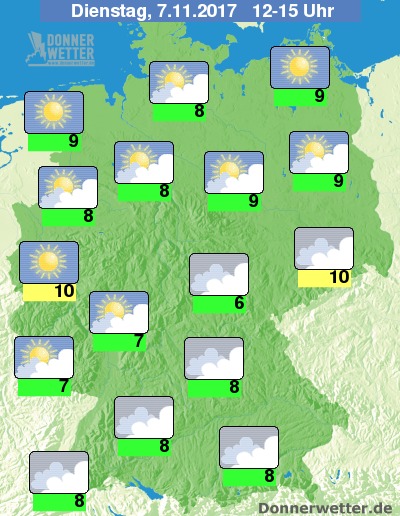 Heute Nachmittag scheint über dem Norden und Westen Deutschlands häufig die Sonne und es ziehen weitgehend nur lockere Wolken durch, dabei bleibt es trocken. Weiter nach Süden und Osten hin werden die Wolken dagegen immer kompakter und vereinzelt fällt auch etwas Regen, mehrheitlich bleibt es aber trocken. Die Temperatur erreicht 6 bis 10 Grad.