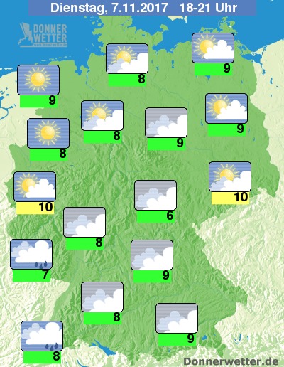 Heute Abend ziehen im Südwesten dichte Wolken mit Regen auf, auch über der übrigen Südhälfte Deutschlands bleibt es weitgehend bedeckt, dazu jedoch mehrheitlich trocken. Im Norden und Westen kann sich die Sonne häufiger zeigen und gebietsweise ist es sogar sonnig, dazu bleibt es trocken. Die Temperatur liegt anfangs noch bei 6 bis 10 Grad.