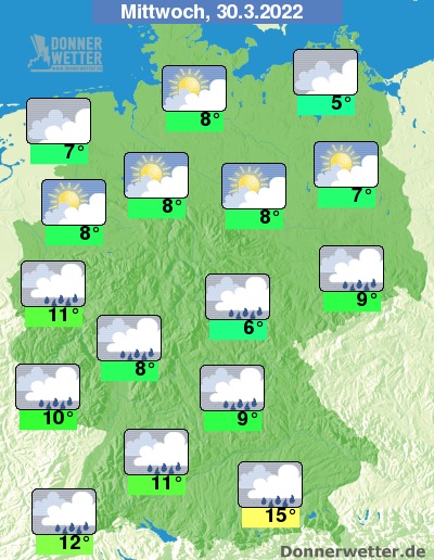 Am Mittwoch ist es verbreitet stark bewölkt oder bedeckt, dabei bilden sich im Süden vielerorts, über der Landesmitte vereinzelt Schauer. Weiter nach Norden hin bleibt es weitgehend trocken, hier sind auch einige Auflockerungen möglich. Die Temperatur steigt auf 5 Grad in Rostock und bis 15 Grad in München.