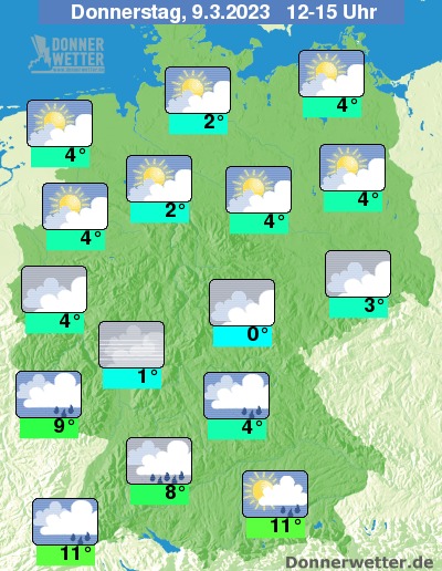 Heute Nachmittag ist es über der Nordhälfte der Republik oft locker bis aufgelockert, teils auch stark bewölkt, dazu bleibt es hier weitgehend trocken. Im Süden bleibt es dagegen bedeckt und es fällt zeitweise Regen, zur Landesmitte bleibt es bei starker bis dichter Bewölkung meist trocken. Die Temperatur liegt bei 0 Grad im Eichsfeld und bis 11 Grad am Oberrhein.