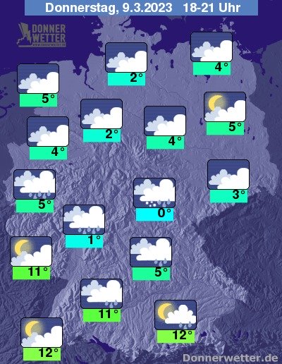 Heute Abend ist es praktisch landesweit stark oder dicht bewölkt, dazu klingen die Niederschläge auch im Süden langsam ab, jedoch fallen über der Südhälfte auch weiterhin hier und da noch ein paar Tropfen, zur Mitte hin auch Flocken. Im Norden bleibt es weitgehend trocken. Die Temperatur liegt bei 0 Grad in Jena und bis 12 Grad in München.