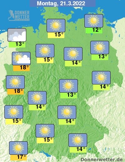 Am Montag zeigt sich das Wetter verbreitet sonnig, im Nordwesten halten sich jedoch hier und da einige, teils dichte Wolken, dabei bleibt es trocken. Die Temperatur steigt auf 12 Grad in Stralsund und bis 18 Grad in Düsseldorf.
