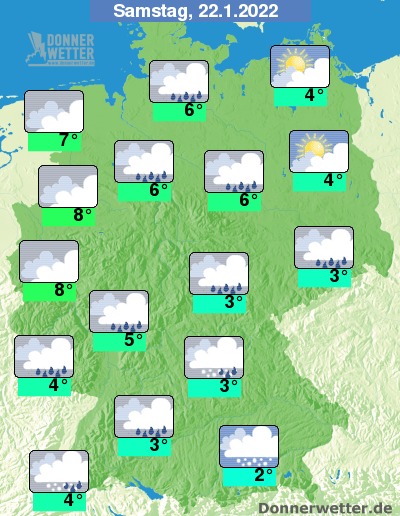Am Samstag bleibt es über der Südhälfte bedeckt und es fällt vielerorts Regen, im Süden meist Schnee oder Schneeregen. Im übrigen Land halten sich meist auch dichte Wolken, vereinzelt sind aber auch Auflockerungen möglich, zudem fällt nur selten Regen. Die Temperatur steigt auf 2 Grad in München und bis 8 Grad in Münster.
