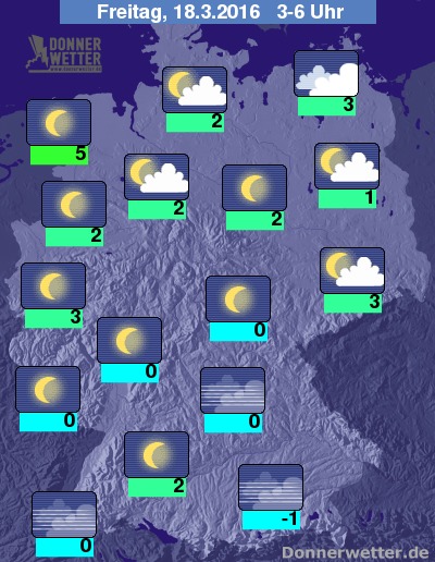 In der folgenden Nacht ziehen über Mecklenburg-Vorpommern dichte Wolken auf, dazu bleibt es aber meist trocken. Im Norden und Osten ziehen hier und da lockere Wolken auf, die jedoch keinen Regen bringen. Im großen Rest des Landes bleibt es sternenklar und dazu trocken. Die Temperatur sinkt auf 5 Grad an der Nordseeküste und bis -1 Grad in München.