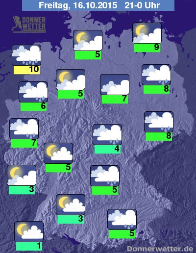 In der Nacht zum Samstag ziehen über die Osthälfte und über den Norden Deutschlands meist dichte Wolken hinweg und es fällt zeitweise Regen. Im äußeren Südwesten und Westen ziehen ebenfalls oft dichte Wolken mit Regen durch. Im übrigen Bundesgebiet ist es teils locker, teils stärker bewölkt, aber dabei meist trocken. Die Temperatur sinkt auf 9 Grad in Neubrandenburg und bis Werte um 0 Grad an der Schwäbischen Alb. Stellenweise ist zum Morgen Glätte durch überfrierende Nässe oder Rauhreif möglich.