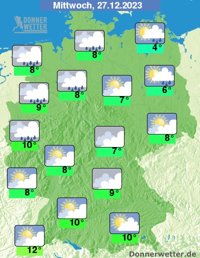 Heute zeigt sich der Süden zum Teil heiter. Im übrigen Land ist es hingegen meist stark bewölkt oder trüb, im Norden und zum Teil im Westen fällt gebietsweise Regen, während es sonst weitgehend trocken bleibt. Die Temperatur erreicht nur 4 Grad in Vorpommern und bis 12 Grad im Breisgau. An der Ostsee weht ein zunehmend starker, an der Nordsee stürmischer Wind mit Sturmböen.
