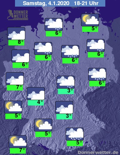 Heute Abend breitet sich der Regen praktisch auf die gesamte Nordosthälfte Deutschlands aus. Auch an den Alpen sind bei dichten Wolken Regen- oder Schneefälle möglich. Im übrigen Bundesgebiet ist es auch oft stark, teils aber auch aufgelockert bewölkt, dazu bleibt es weitgehend trocken. Die Temperatur liegt bei 3 bis 8 Grad.