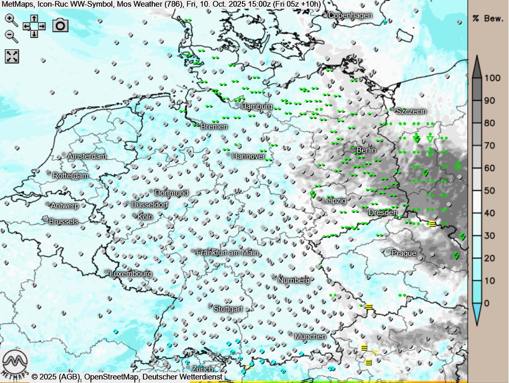 Am Freitagnachmittag zeigt sich der Himmel meist stark bewölkt oder es ist bedeckt. Vor allem in der Osthälfte muss dabei mit etwas Regen gerechnet werden. Größere Auflockerungen gibt es am Nachmittag vor allem im Süden und Südwesten.
