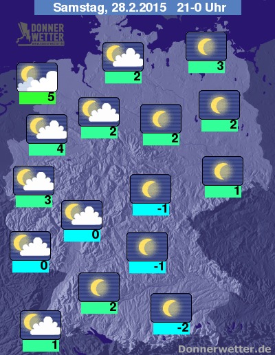 Heute Abend bleibt es in der Osthälfte des Landes meist sternenklar oder locker bewölkt, weiter nach Westen ziehen teils dichtere Wolken durch, zumeist bleibt die Bewölkung aber aufgelockert und dazu bleibt es auch trocken. Die Abendtemperatur liegt bei 5 Grad an der Grenze zu den Niederlanden und etwa -2 Grad in München.