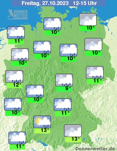 Heute Nachmittag ist es im Süden teils stark, teils aufgelockert bewölkt und es bilden sich nur vereinzelt Schauer. Im übrigen Land bleibt es bei dichten Wolken und es fällt verbreitet, teilweise auch langanhaltender Regen. Die Temperatur liegt bei 9 Grad im Vogtland und 13 Grad in Schwaben.