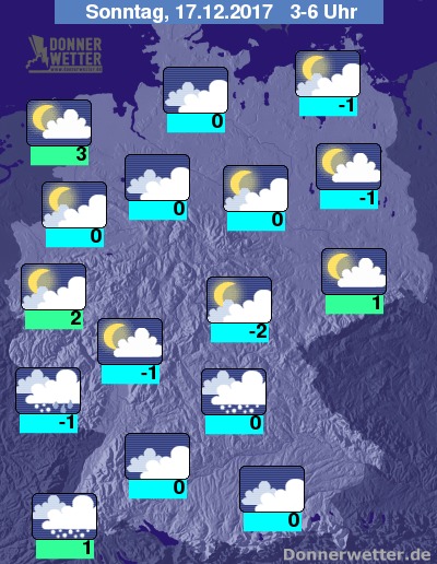 In der Nacht zum Sonntag fällt im Süden unter weitgehend dichter Bewölkung gebietsweise Schnee oder Schneeregen. Weiter nach Norden hin ist es zum Teil stark, vor allem nach Osten hin aber auch oft nur gering bewölkt, hier bleibt es verbreitet trocken. Die Temperatur sinkt auf 3 bis -2 Grad.