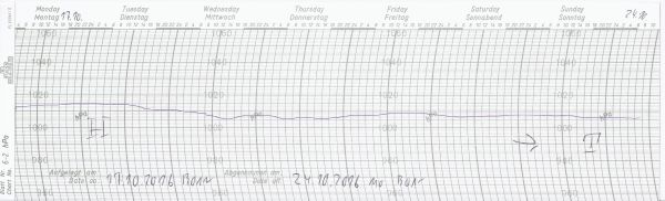 Mit Tiefdruckeinfluss in die neue Woche - unser Schrieb zeigt den Luftdruckverlauf an unserer Wetterstation in Bonn im Zeitraum 17.10.-24.10.2016. Gut zu erkennen ist der Übergang von Hoch- zu Tiefdruckeinfluss.