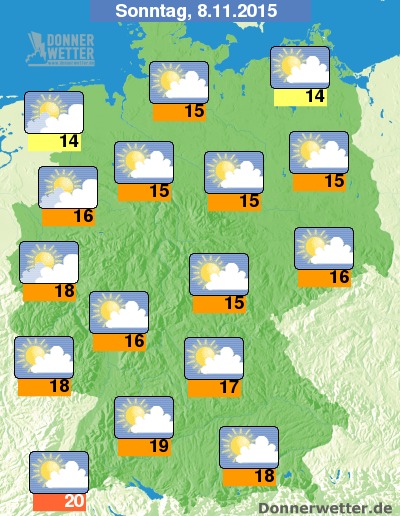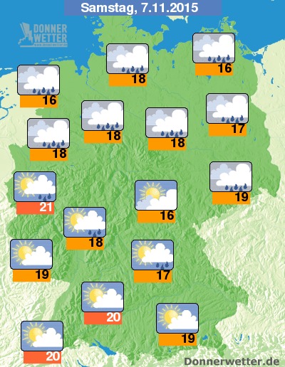 Deutschlandweit sehr mild zeigen sich die Temperaturen. Sie liegen bei Höchstwerten um 16 Grad C in Ostfriesland und 21 Grad C im Rheinland.