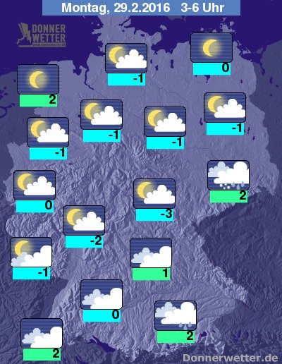 In der bevorstehenden Nacht kommen im Alpenvorland sowie in Sachsen Regen, Schneeregen oder Schneefall auf, dabei besteht verbreitet Glättegefahr! Nach Norden und Westen hin bleibt der Himmel meist locker bewölkt oder sternenklar, hier bleibt es genauso trocken, wie in einem breiten Streifen zwischen dem Saarland und Berlin-Brandenburg, wo meist aufgelockerte Bewölkung durchzieht. Die Temperatur sinkt auf 2 Grad an der Nordsee und bis etwa -3 Grad am Hunsrück.