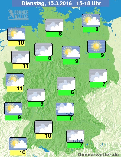 Heute Nachmittag verlagert sich der Regen mehr und mehr auf den Süden Deutschlands, sonst bleibt es oft noch stark bewölkt, hier und da kann es aber auch wieder auflockern und die Sonne sich zeigen, dazu bleibt es dann auch weitgehend trocken. Die Temperatur steigt auf kühle 6 Grad im Thüringer Becken und bis auf 11 Grad im Rheinland.