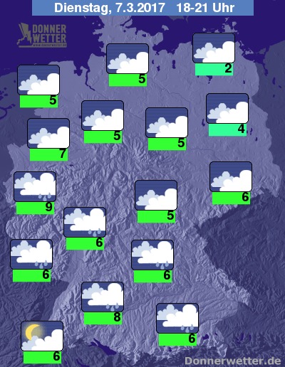 Heute Abend ist es weiterhin meist stark bewölkt, dabei fällt im Süden und Westen gebietsweise Regen, sonst bleibt es jedoch überwiegend trocken. Hier und da lockert die Bewölkung im Abendverlauf auch etwas auf. Die Temperatur liegt bei 2 bis 9 Grad.