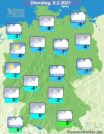 Am Dienstag bleibt es häufig stark bewölkt, hier und da und vor allem im Westen sind aber auch Auflockerungen möglich, hier bleibt es zudem meist trocken. Im übrigen Land fällt hingegen gebietsweise Schnee. Im Alpenvorland kann bei mildere Luft auch Schneeregen oder Regen fallen. Die Temperatur steigt nur noch auf -9 Grad in Erfurt und bis 5 Grad in Berchtesgaden.